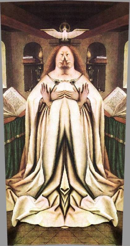 Barbara, das Turmfrollein erscheint übrigens auch auf dem rechten Flügel des Altars in der Szene "Die Pilger", zusammen mit einer anderen Jungfrau: