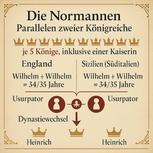 Die Normannen etablierten nach offizieller Geschichte im Mittelalter zwei bedeutende Königreiche in Europa: England und Sizilien. Obwohl geografisch voneinander getrennt, weisen die Herrschaftsstrukturen und historischen Abläufe dieser beiden Reiche erstaunliche Ähnlichkeiten auf, die fast wie ein Spiegelbild der Geschichte wirken.