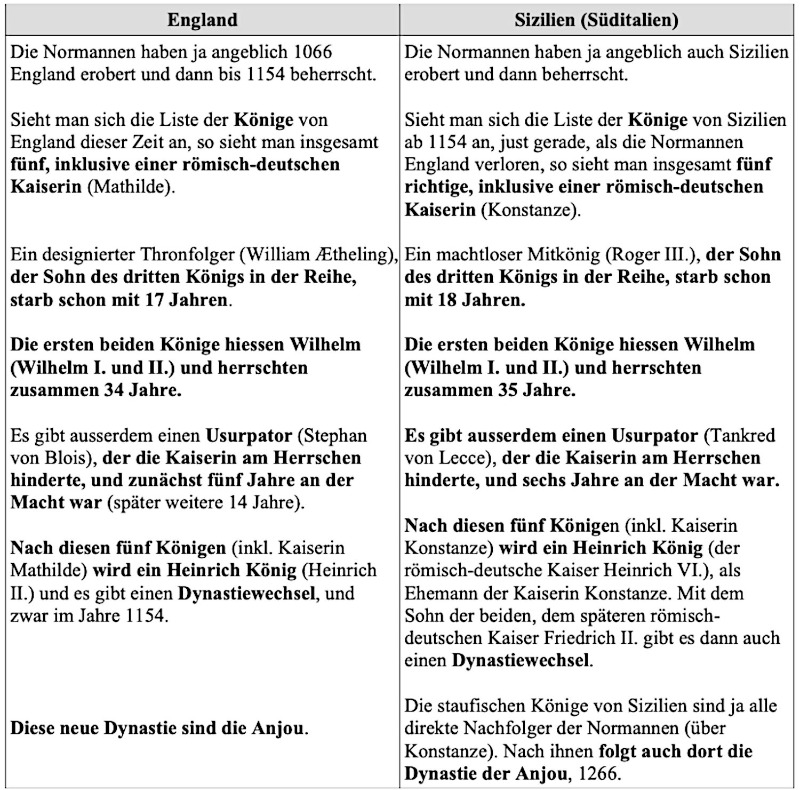 Die Parallelen sind unübersehbar: In beiden Königreichen gab es eine Abfolge von fünf Herrschern, darunter zwei Könige namens Wilhelm an der Spitze. In beiden Fällen wurde eine Kaiserin von einem Usurpator an der Machtübernahme gehindert, und in beiden Linien starb ein junger Thronfolger, bevor er seine Herrschaft antreten konnte. Schließlich kam es in beiden Fällen zu einem Dynastiewechsel, bei dem ein König Heinrich beteiligt war, wobei bemerkenswerterweise in beiden Gebieten später die Anjou-Dynastie an die Macht kam.