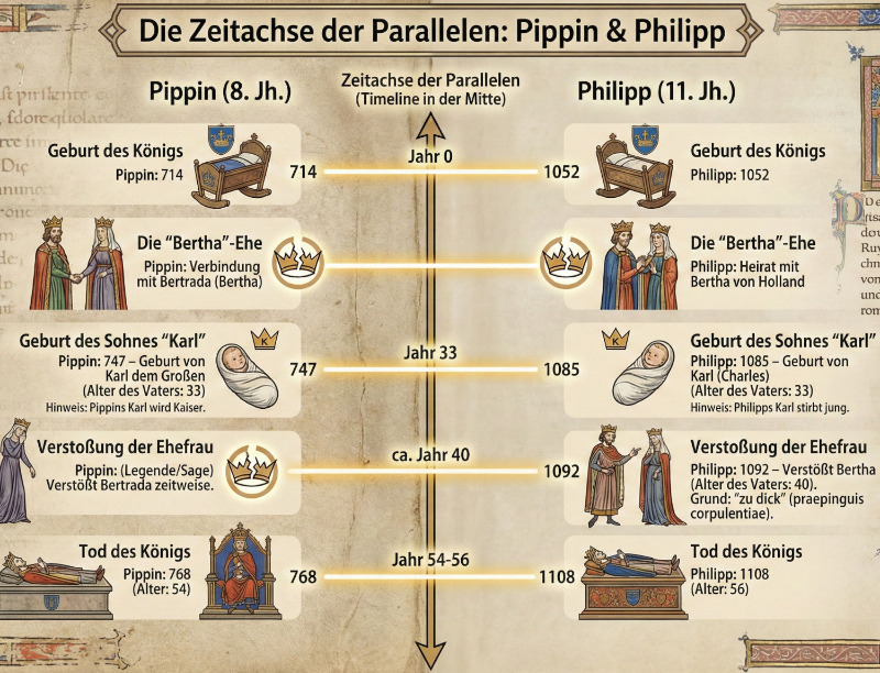 Dazu passt meine folgende vorherige Entdeckung: Ich hatte bereits zvor herausgefunden, dass die beiden fränkischen/französischen Könige Pippin III. Und Philipp I. Verdopplungen darstellen, im Abstand von 338-340 Jahren, also ganz nahe an der obigen Differenz. (siehe dazu meine “Wohlstrukturierte Geschichte”, S. 81 ff.).