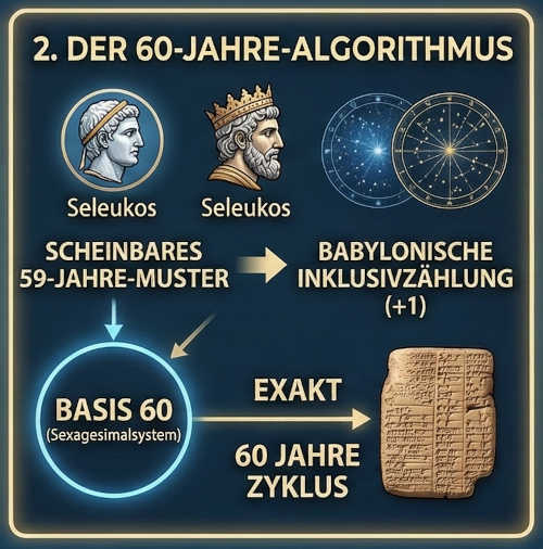 Ein scheinbarer 59-Jahre-Rhythmus bei den Herrschaftswechseln von Königen namens Seleukos entpuppt sich durch die Anwendung der antiken babylonischen Inklusivzählung – die beide Endjahre zählt – als ein perfekter 60-Jahre-Algorithmus. Diese Taktung korrespondiert direkt mit dem babylonischen Sexagesimalsystem (Basis 60), das in Mesopotamien für Astronomie und Zeitrechnung maßgeblich war.