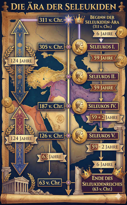 Durch detaillierte Strukturanalysen wird nachgewiesen, dass die seleukidische Zeitachse einem strengen mathematischen, spiegelbildlichen und numismatischen Algorithmus folgt. Zentrales Element ist die Platzierung von Antiochos III. ("dem Großen") und Seleukos IV. als exakte chronologische Mitte (187 v. Chr.), flankiert von jeweils exakt 124 Jahren Abstand zu Reichsgründung und Zusammenbruch.