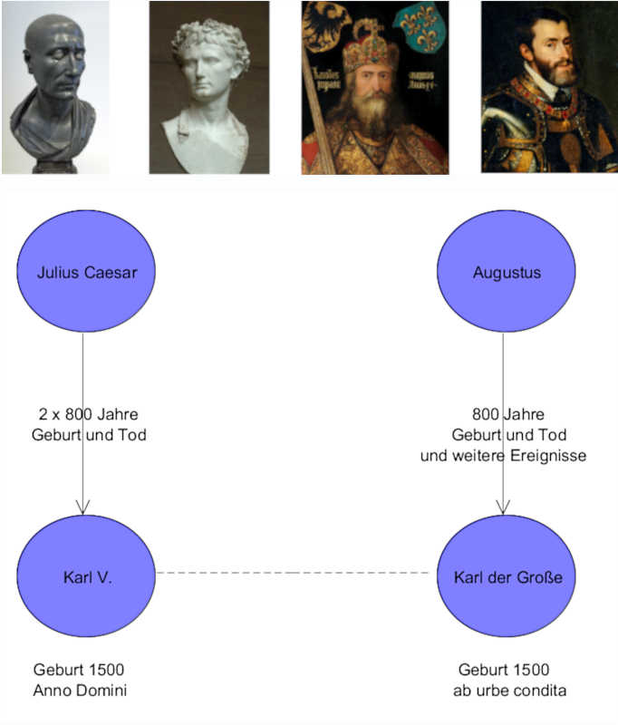 - Doch damit nicht genug: Weitere 800 Jahre später taucht in diesem Raster exakt Kaiser Karl V. auf, genau 2 x 800 Jahre nach Julius Caesar.