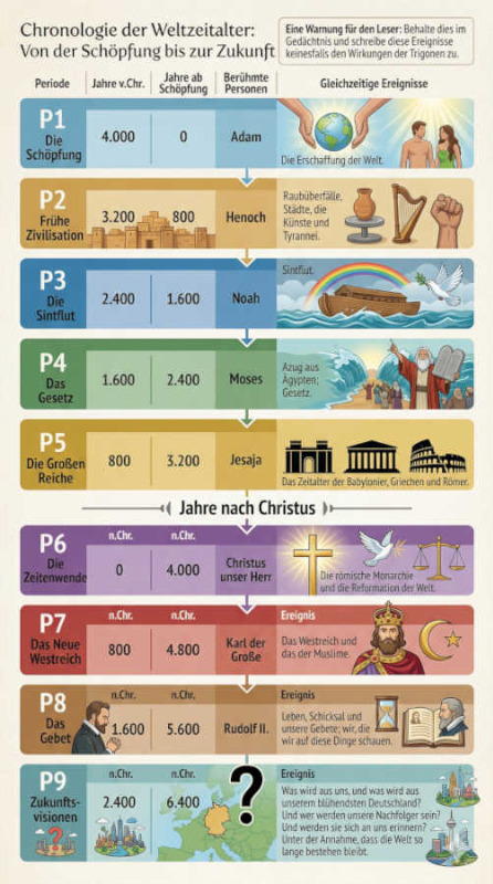 - Auf dieser Basis entwarf Kepler eine epochenhafte Gliederung: Er teilte die 5600 Jahre seit der Schöpfung durch 800 und ordnete die Knotenpunkte Figuren wie Adam, Noah, Moses und schließlich Christus (im Jahr 4000 ab Schöpfung) zu. Genau 800 Jahre nach Christus folgte in dieser Logik Karl der Große.