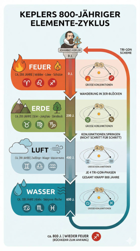 - Nach vier solchen Phasen (Feuer, Erde, Luft, Wasser) sind knapp 800 Jahre vergangen, das Muster hat den Tierkreis durchlaufen und beginnt wieder von vorn.